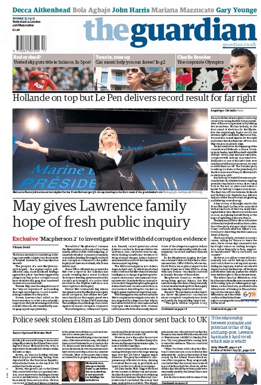 Η εφημερίδα Guardian υπογραμμίζει πως η χθεσινή νύχτα ήταν μια «γλυκόπικρη νίκη για την Αριστερά» τονίζοντας πως ο Ολάντ βρίσκεται «στην κορυφή του κύματος της Αριστεράς», όμως τα «εκπληκτικά» αποτελέσματα της Μαρίν Λεπέν πάγωσαν τον ενθουσιασμό.
