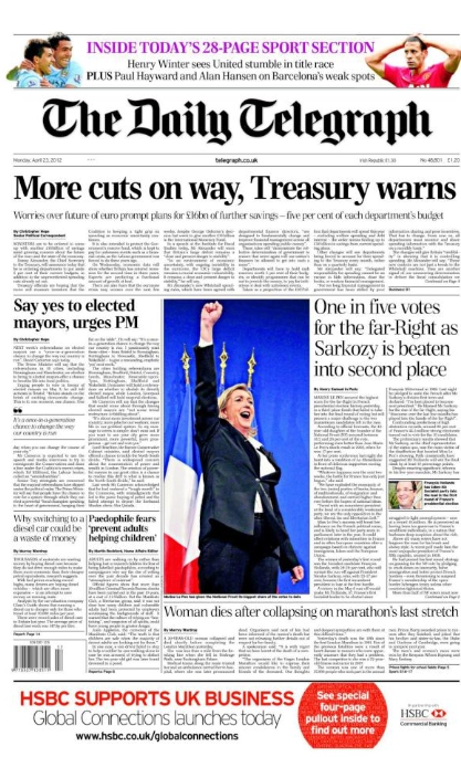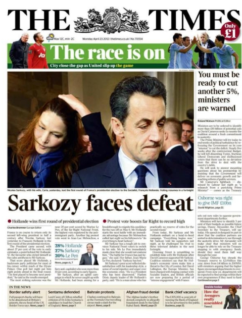 Με τίτλο «Ο Σαρκοζί αντιμέτωπος με την ήττα», οι βρετανικοί Times τονίζουν πως η Μαρίν Λεπέν με το ποσοστό ρεκόρ του 18,1% είναι αυτή που θα καθορίσει τα αποτελέσματα του δευτέρου γύρου της 6ης Μαΐου. Η ναυαρχίδα του βρετανικού τύπου χαρακτηρίζει όμως τον Ολάντ ότι προτείνει οικονομικά μέτρα με στόχο τον εντυπωσιασμόι και δεν κρύβει την ανησυχία της για το οικονομικό του πρόγραμμα.
