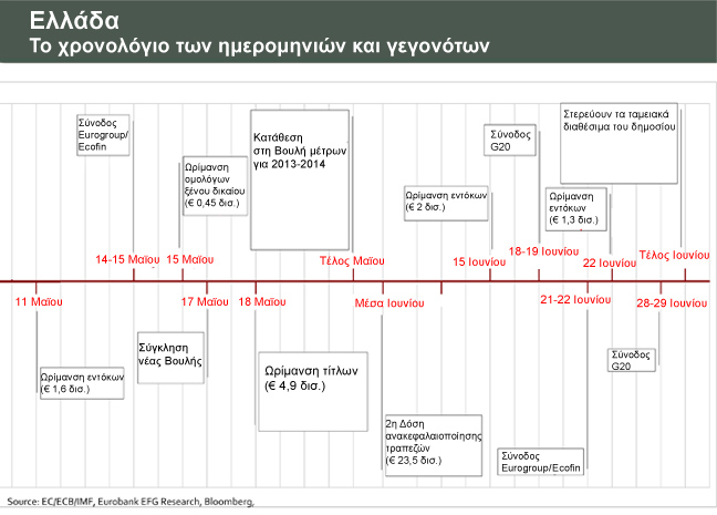 Παράλληλα κάποιοι πολιτικοί αρχηγοί εξακολουθούν να λειτουργούν με γνώμονα το κομματικό τους συμφέρον και μόνο, αδιαφορώντας για τις επιπτώσεις που μπορεί αυτό να έχει για τη χώρα, υπάρχουν κάποιες ημερομηνίες μέχρι το τέλος Ιουνίου, οι οποίες θα κρίνουν πολλά για το μέλλον της οικονομίας μας και της Ελλάδας συνολικά.